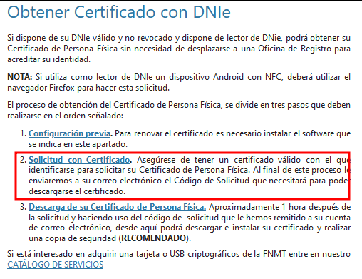 Para obtenerlo necesitamos ir a la página de la FNMT y en el apartado de certificados electrónicos y persona física, podemos pedir el nuestro. Para ello debemos de seleccionar uno de los dos métodos, el más rápido es el segundo ya que se puede hacer al momento, pero requiere el acceso a un lector de DNIe.