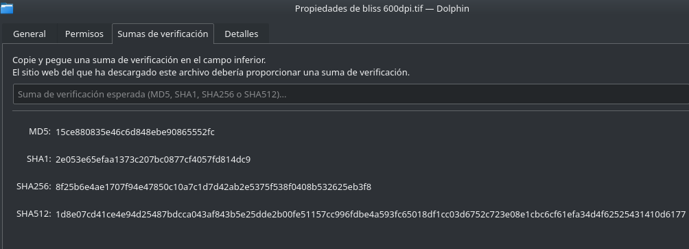 Y si estamos en sistemas Linux podemos usar el comando sha1sum seguido del archivo o ciertos exploradores de archivos como dolphin que tiene una pestaña de sumas de verificación.